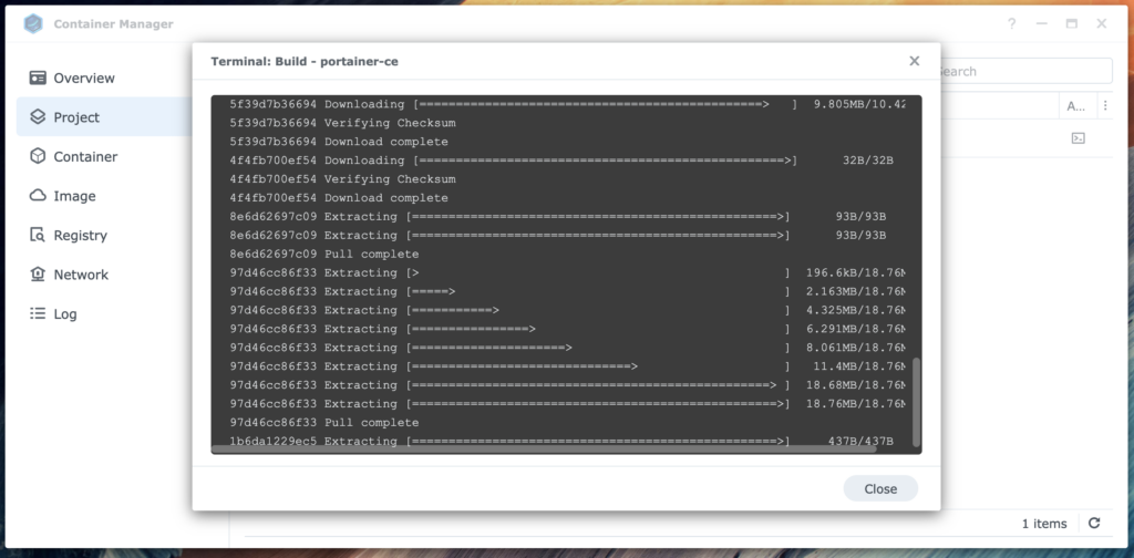 - Select Start the project once it is created, and then finish the project by selecting Done. This will cause Portainer to download and install. You can close the Build view whenever you want. Portainer will continue to install in the background, regardless of when you close the Build view.